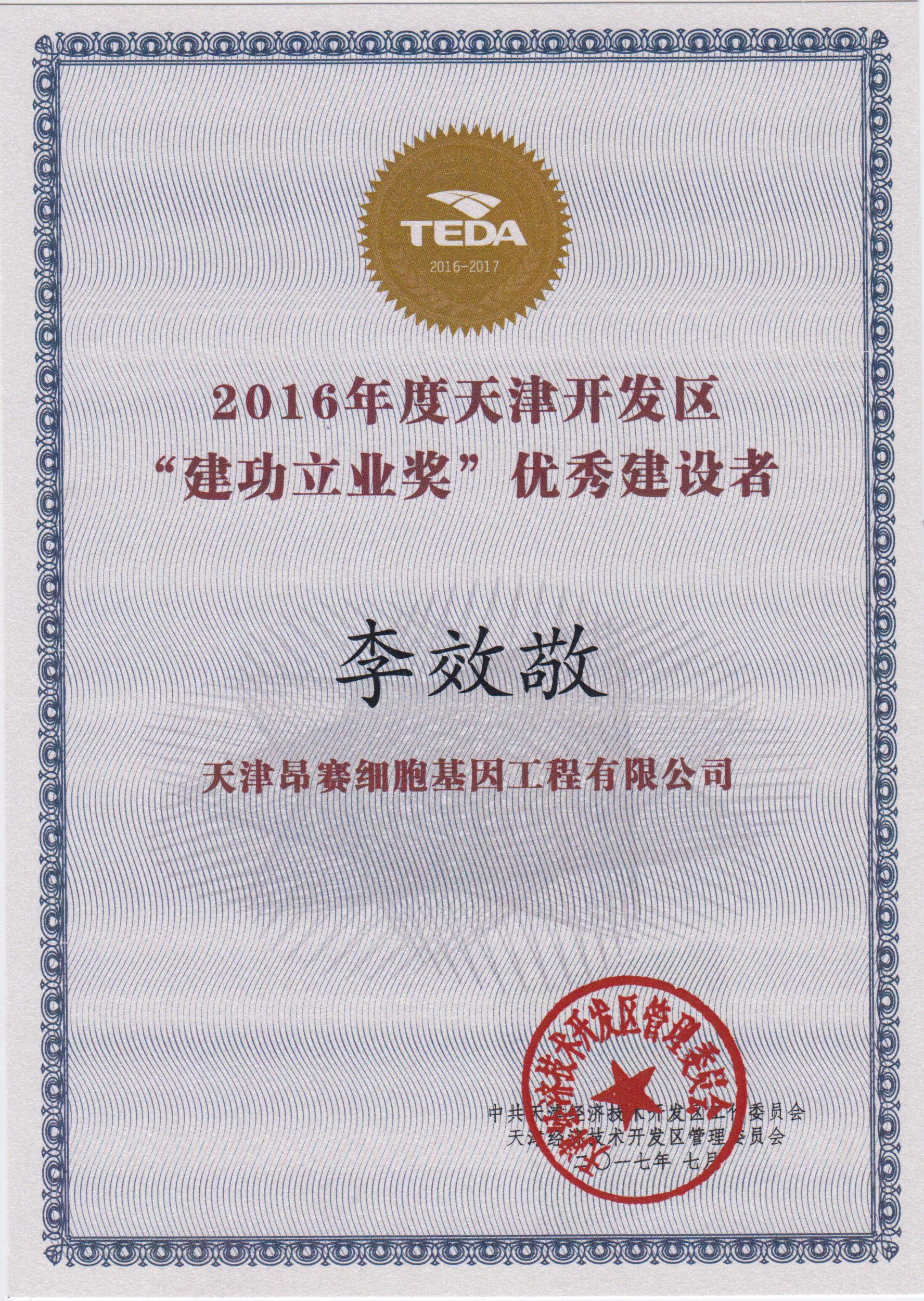 ? ? 2017年9月20日,我公司李效敬同志榮獲天津經(jīng)濟技術(shù)開發(fā)區(qū)頒發(fā)的2016年度“建功立業(yè)獎”。
